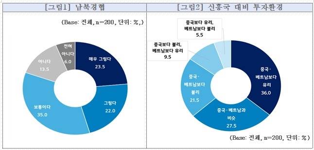 전체 기업을 대상으로 한 질문에서는 응답 중소기업의 45.5%가 남북경제협력이 한국의 경제발전과 기업 성장에 ‘긍정적인 영향’을 미친다고 응답했으며, 중국이나 베트남 등 신흥국 대비 북한의 투자환경이 ‘유리’하다고 응답한 업체도 36.0%에 달했다.