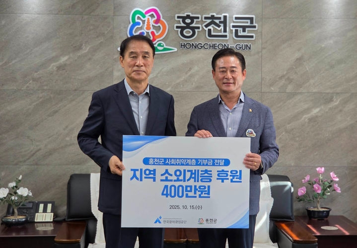 이미지 확대보기한국광해광업공단(KOMIR)은 15일 강원 홍천군을 방문해 지역 내 취약계층을 돕기 위한 후원금 400만원을 전달했다.
