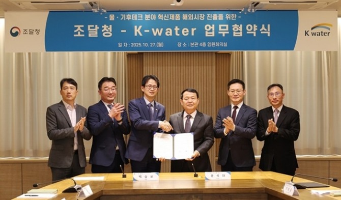 이미지 확대보기한국수자원공사(K-water)는 지난 27일 대전 본사에서 조달청과 ‘물·기후테크 분야 혁신제품 해외시장 진출 지원’을 위한 업무협약을 체결했다.