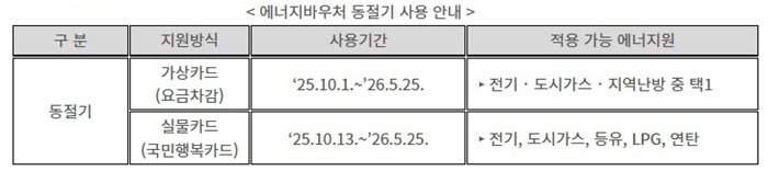 하절기와 달리 동절기에는 수급자의 주거 환경과 선호하는 방식에 따라 요금고지서에서 자동으로 차감되는 가상카드 방식과 사용자가 직접 결제하는 실물카드 방식 중에 선택할 수 있다.