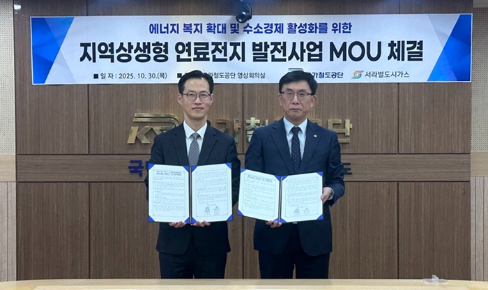 이미지 확대보기국가철도공단은 서라벌도시가스와 ‘지역상생형 연료전지 발전사업’ 추진을 위한 업무협약을 체결했다고 31일 밝혔다.