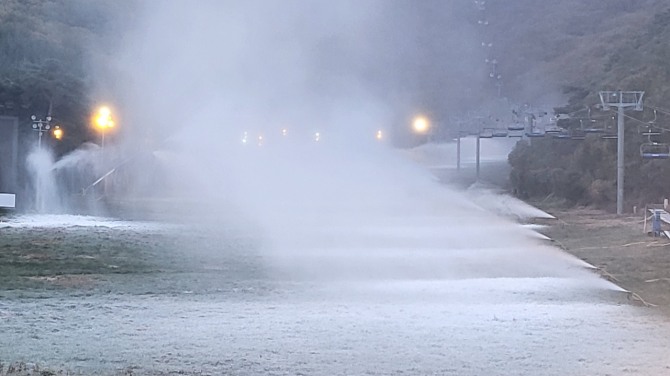이미지 확대보기무주덕유산리조트는 "지난 4일 밤부터 기온이 영하권으로 떨어져 곧바로 제설 장비를 가동해 5일 오전 3시부터 스피츠 하단 슬로프에 첫 인공 눈을 뿌리는 제설 작업을 시작했다"고 밝혔다.
