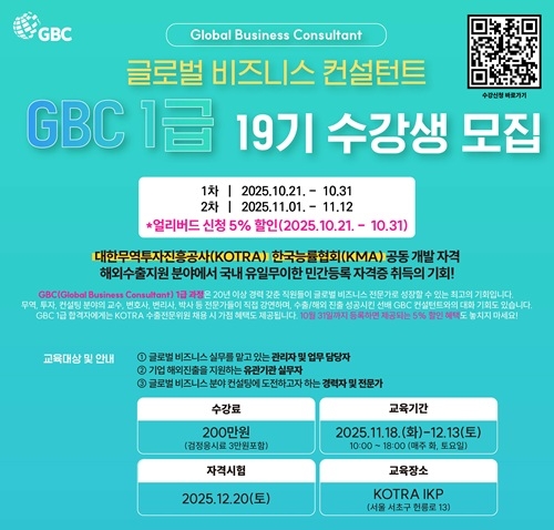 GBC 1급 과정은 글로벌 비즈니스 실무 전반을 다루는 국내 유일의 교육과정으로, 2018년 개설 후 지금까지 400여 명의 수료생을 배출했다. 19기 과정은 이덜 18일부터 4주간 주 2회, 코트라아카데미에서 진행되며 종강 뒤 검정시험도 시행된다.