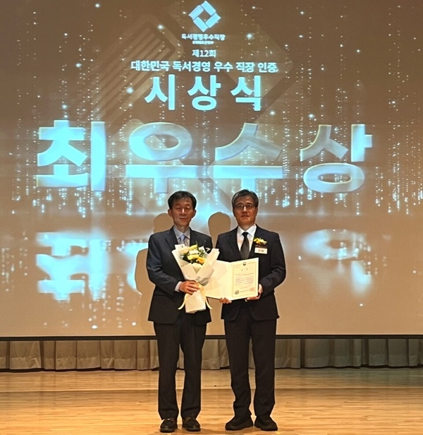 이미지 확대보기한국남부발전이 지난 5일 '제12회 대한민국 독서경영 우수직장 인증'에서 문화체육부 장관상(최우수상)을 수상했다. 남부발전의 지속가능한 독서경영이 조직 내 혁신적인 문화를 조성하는 한편 직원들의 역량 강화에 기여한 점을 인정받은 결과다.