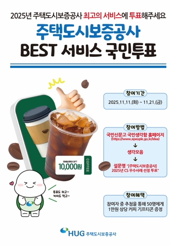 이미지 확대보기주택도시보증공사(HUG)가 이달 21까지 ‘2025년 CS 우수사례 국민투표(대국민 선호도 조사)’를 진행한다.