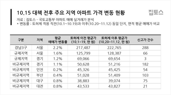 이미지 확대보기14일 부동산 중개업체 집토스에 따르면 10·15 부동산 대책으로 새로 토지거래허가구역 구역이 된 서울 지역의 아파트 평균 매매가격은 지정 전에 비해 1.6% 올랐다.
