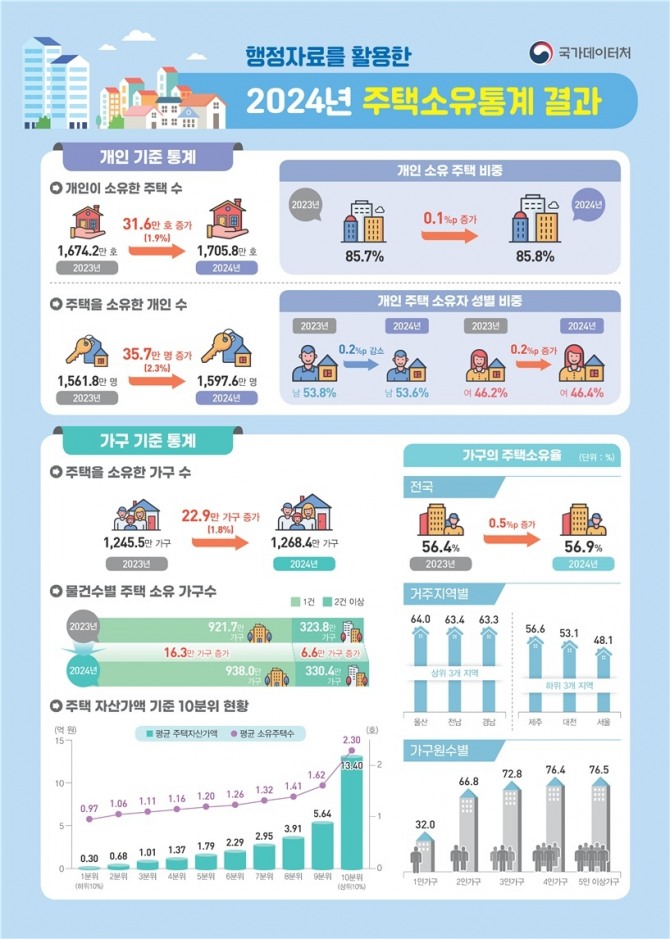 올해 일반가구는 2229만4000가구였으며, 이 중 1268만4000가구가 주택을 소유해 주택 소유율은 56.9%로 집계됐다. 전년 대비 0.5%p 상승한 수치다.