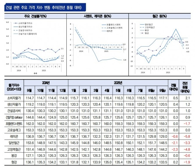 건설산업연구원도 2025년 11월 월간 건설시장 동향에서 “중간재 건설용 수입물가가 전년 동월 대비 증가했지만 원재료 물가가 하락하고 국내 중간재 물가도 하락한 상황”이라며 “전반적으로 건설용 생산재 물가 상승률은 1% 미만으로 안정적인 상황”이라고 설명했다.