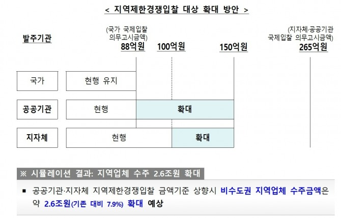우선 정부는 공공기관(88억 원 미만) 및 지자체(100억 원 미만)의 지역제한경쟁입찰 기준을 150억 원 미만까지 확대하기로 했다. 정부 시뮬레이션에 따르면, 기준 상향 시 지역업체 수주 금액은 기존 대비 7.9%(약 2조6000억 원) 늘어날 전망이다.