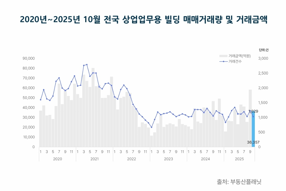 정수민 부동산플래닛 대표는 “10월 전국 상업업무용 빌딩 시장은 거래량과 거래금액이 전월 대비 모두 감소했는데 금리 인하 지연으로 투자 심리 회복과 실질적인 가격 조정 속도가 둔화된 모습”이라며 “입지와 자산을 기준으로 한 옥석 가리기가 더욱 심화될 것”이라고 말했다.