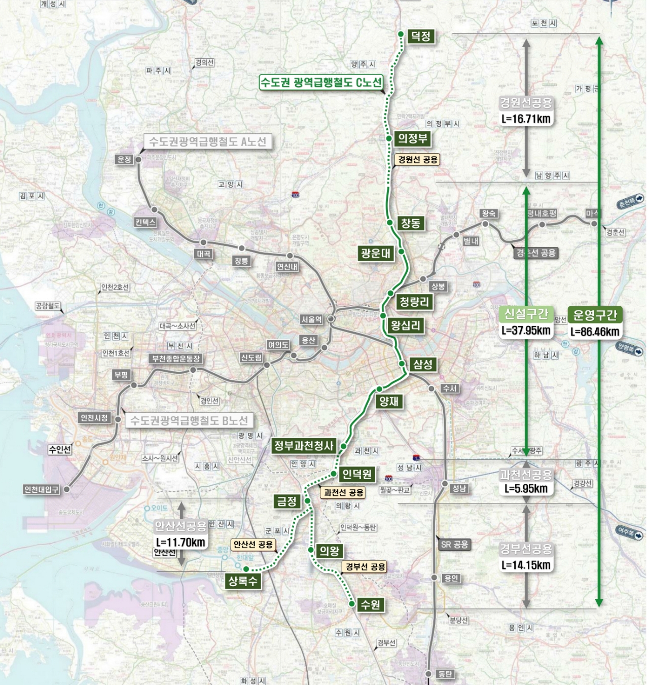 GTX-C 노선은 경기도 양주시 덕정역에서 수원역까지 86.5km를 연결하는 노선이다. 이 노선이 개통하면 덕정역에서 삼성역은 29분, 수원역에서 삼성역은 27분 만에 이동이 가능해진다.