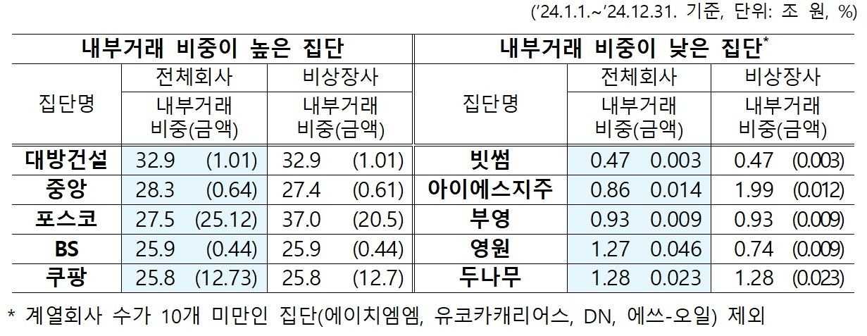 이번 조사에서 국내계열사 간 내부거래 비중이 높은 그룹은 대방건설을 비롯해 중앙(28.3%), 포스코(27.5%), BS(25.9%), 쿠팡(25.8%) 순이었다.