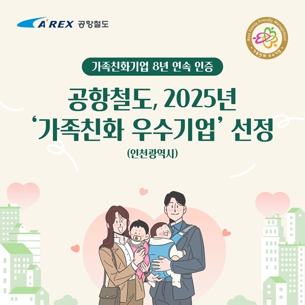 공항철도는 이번 재인증을 통해 지난 2017년 첫 인증 이후 8년 연속 가족친화기업으로 인증받게 됐다. 특히 인천광역시로부터 ‘2025년 가족친화인증 우수기업’으로도 선정됐다.