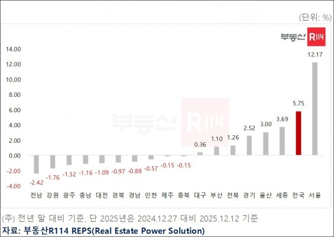 이러한 흐름을 이끈 지역은 단연 서울이다. 서울은 올해 아파트 매매가격이 12% 이상 상승했다. 월간 1% 이상 올랐다는 의미다.