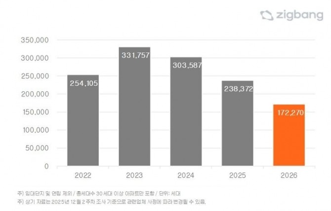 이미지 확대보기직방은 내년 전국 아파트 입주물량이 17만2270세대로 집계됐다고 22일 밝혔다. 이는 올해(23만8372세대)보다 28% 감소한 수치로 최근 몇 년 간의 공급 흐름과 비교해도 적다.