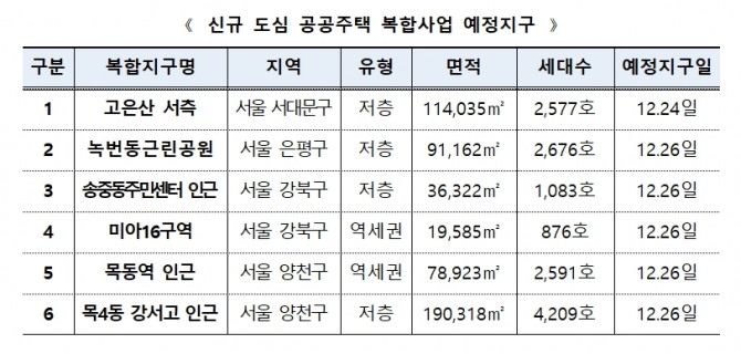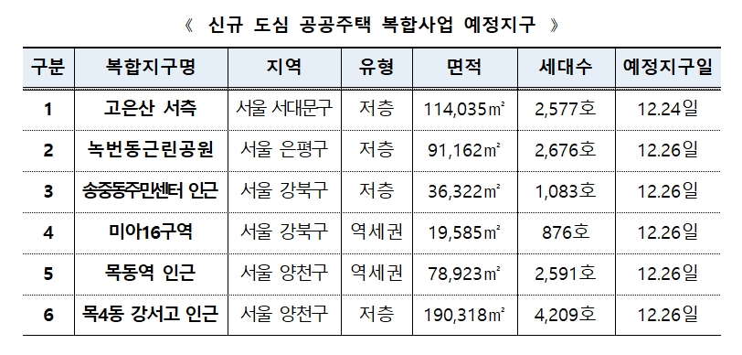 이번에 지정 공고된 곳은 총 6곳으로, △목동역 인근 △목4동 강서고 △고은산 서측 △녹번동근린공원 △송중동 주민센터 인근 △미아16구역이다. 전체 면적은 53만345㎡, 1만4012세대에 달한다.