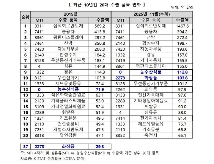 시장 다변화 성과도 가시화됐다. 화장품의 1억 달러 이상 수출국은 10년 전 4개국에서 올해 19개국으로 늘었고, 농수산식품은 13개국에서 17개국으로 확대됐다. UAE(화장품 66%, 농수산식품 39% 증가)와 튀르키예(각각 24%, 66% 증가) 등 글로벌사우스 지역에서 성장세가 두드러졌다.