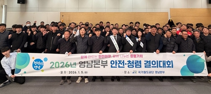 이미지 확대보기국가철도공단 영남본부는 새해를 맞아 정부의 ‘국민 생명 보호’와 ‘현장 중심 안전’ 기조를 현장에 정착시키고 중대재해를 원천 차단하기 위해 ‘2026년 안전·청렴 결의대회’를 개최했다.