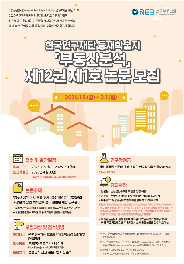 이미지 확대보기한국부동산원은 부동산 분야의 학술 교류 및 연구 활동 장려를 위해 등재학술지 '부동산분석' 제12권 제1호(2026년 4월 30일 발간예정)에 수록할 논문을 2월 1일까지 모집한다.