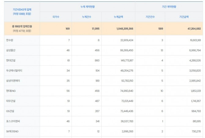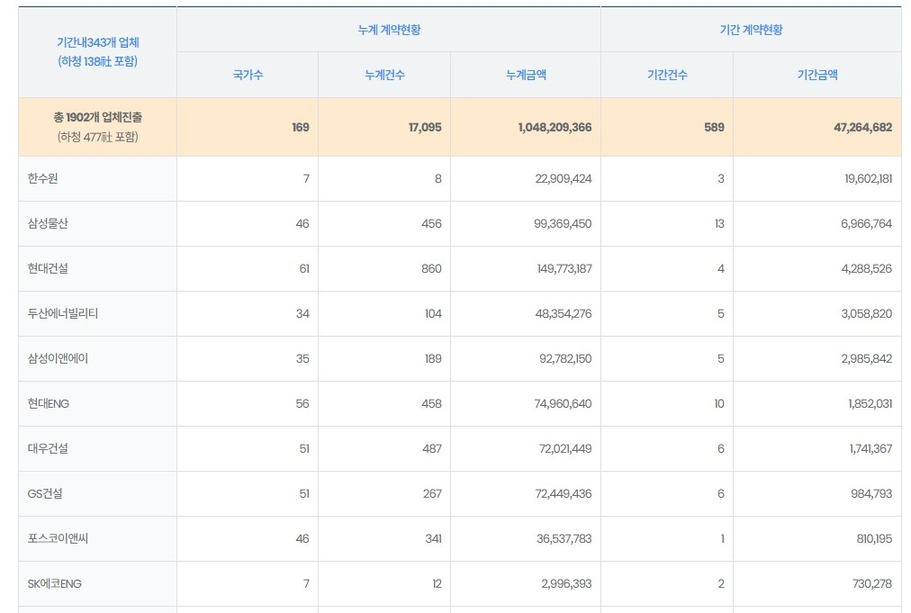 기업별로는 한국수력원자력이 196억200만 달러를 따내며 해외건설 수주 1위를 기록했다.