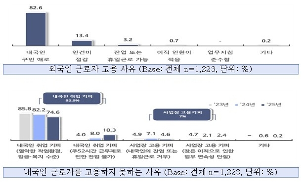조사 결과, 중소기업이 외국인 근로자를 고용하는 이유로 '인건비 절감(13.4%)'보다 '내국인 구인난(82.6%)'이 심하기 때문이며, 국내 중소제조업체의 외국인 근로자 의존도가 높은 것으로 조사됐다.