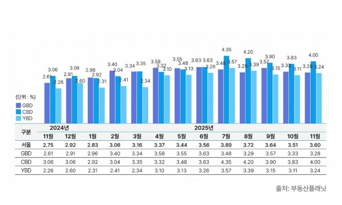 또 지난해 11월 서울시 오피스빌딩 공실률은 3.60%로 전월(3.51%) 대비 0.09%포인트(p) 상승했다.