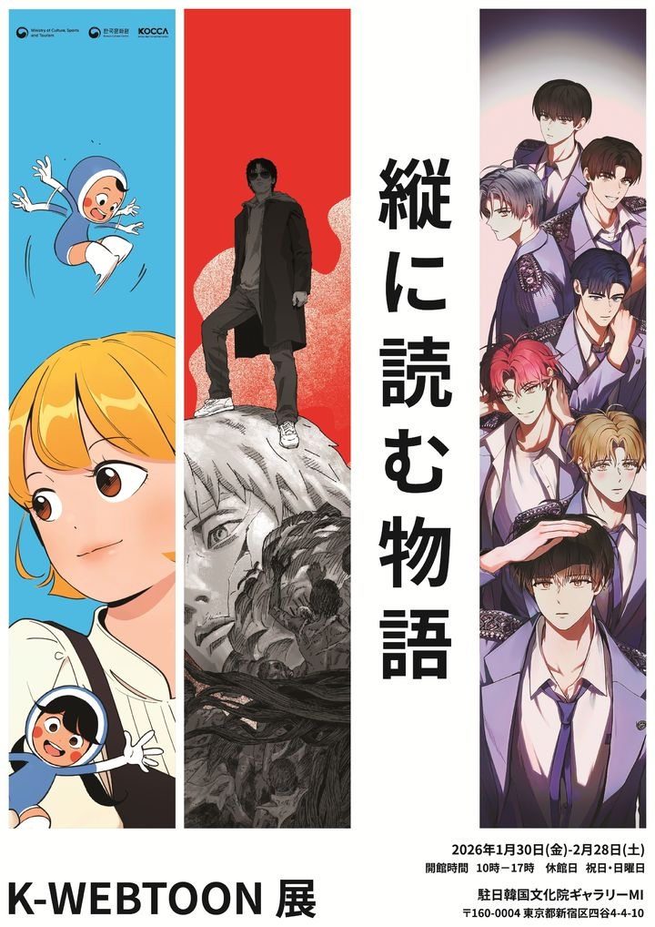 이미지 확대보기한국콘텐츠진흥원은 주일한국문화원과 함께 한국 웹툰의 창작성과 산업적 가치를 일본 현지에 소개하기 위해 ‘세로로 읽는 이야기: 2026 K-웹툰 전시(縦に読む物語 : K-WEBTOON展)’를 이달 30일부터 내달 28일까지 일본 도쿄 주일한국문화원 ‘갤러리MI’에서 개최한다.