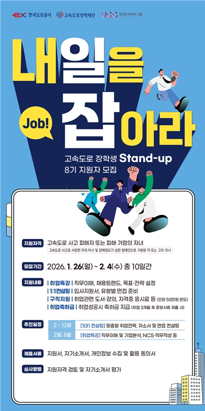 이미지 확대보기한국도로공사와 고속도로장학재단이 고속도로 사고 피해자 및 피해 가정 자녀를 대상으로 오는 2월 4일까지 취업 지원 프로그램 ‘Stand-up’ 8기 참가자를 모집한다.