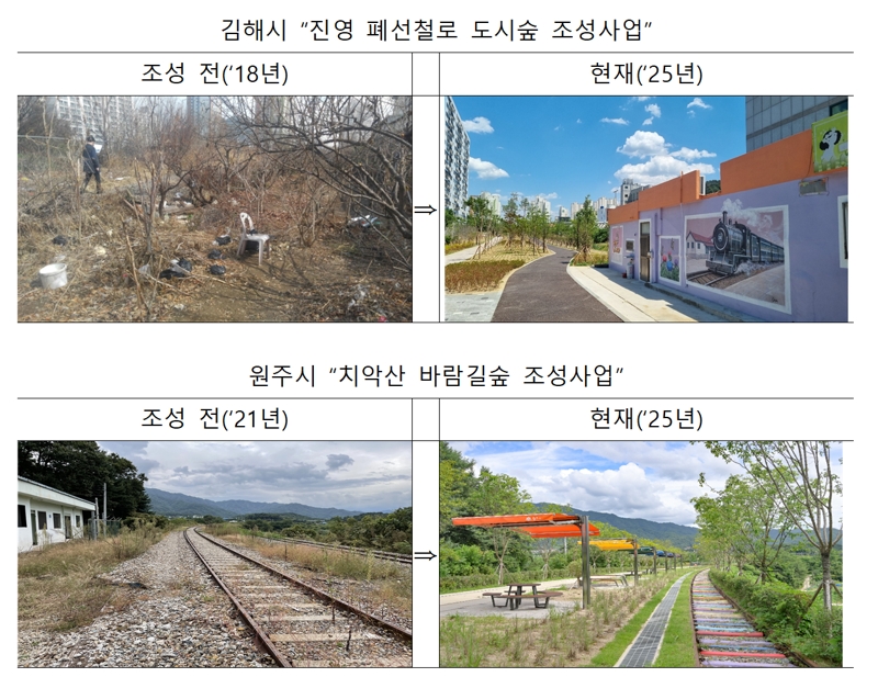 현재까지 49개 지자체에서 81개 사업이 추진 중이며, 김해시 '진영 폐선철로 도시숲 조성사업', 원주시 '치악산 바람길숲 조성사업'은 2025년 산림청 녹색도시 최우수 및 우수사례로 선정된 바 있다.