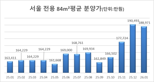 전용 84㎡ 분양가 역시 유사한 움직임을 보였다. 1월 전용 84㎡의 평균 분양가격은 7억770만 원으로 집계됐다. 이는 지난해 9월 이후 5개월 만의 하락 전환이다.