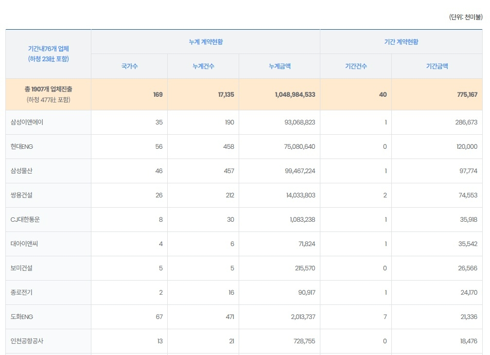 4위는 쌍용건설(7455만 달러·1085억 원)로 적도기니에서 지블로 대통령 레지던스 신축 공사(4744만 달러·690억 원) 등을 수주하며 4위에 올랐다. 5위는 CJ대한통운 건설부문(359만 달러·52억 원)이다. CJ제일제당 헝가리 신공장 건설 프로젝트 수주 등으로 순위권에 들었다.