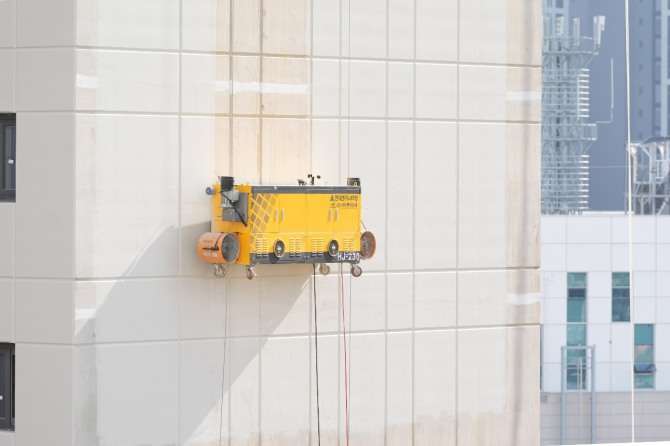 현대엔지니어링이 개발한 외벽도장로봇은 무인·원격제어 방식을 적용해 기존 달비계 기반 외벽 도장 작업을 대체한 것이 가장 큰 특징이다.