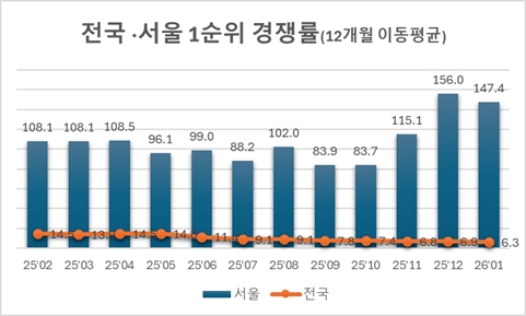 전국 평균 경쟁률은 지난해 5월 14.80대 1을 정점으로 하락세로 전환됐다. 이후 7월 9.08대 1, 8월 9.12대 1, 9월 7.78대 1, 10월 7.42대 1, 11월 6.80대 1, 12월 6.93대 1, 1월 6.33대 1로 점진적으로 낮아지며 7개월 연속 한 자릿수 구간에서 등락을 이어가고 있다.