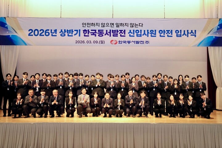 이미지 확대보기한국동서발전이 지난 9일 울산 중구 본사 대강당에서 ‘2026년 상반기 신입사원 안전 입사식’을 개최했다.