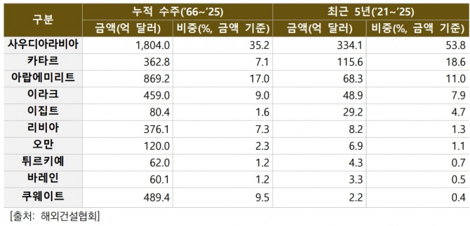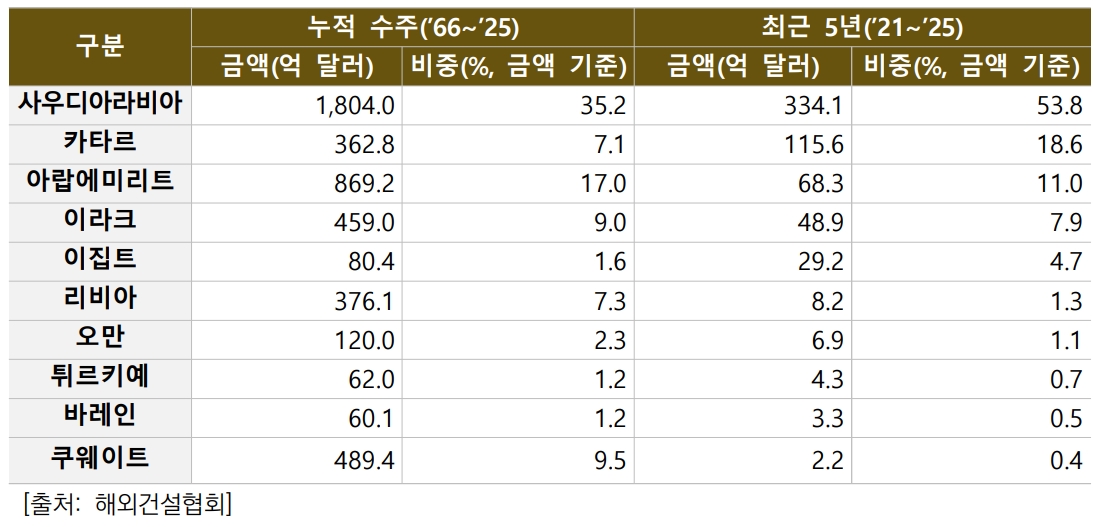 한편, 최근 5년(2021~2025년) 간 한국 기업의 해외 건설 수주 중 중동지역의 비중은34.6%(620억5000만 달러)다.