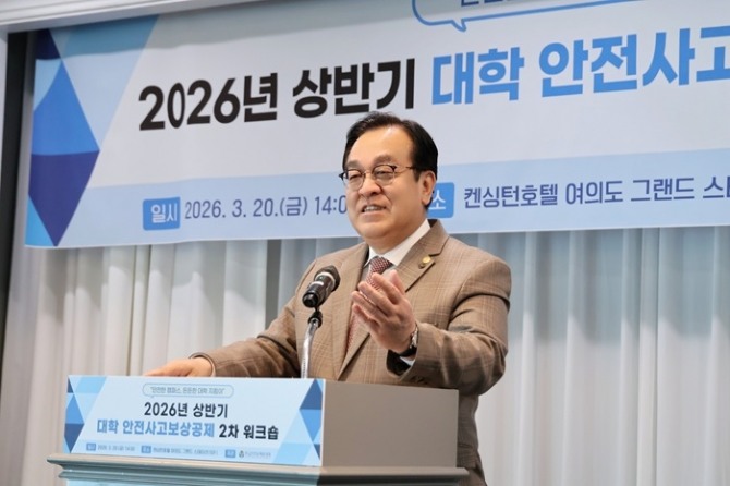 정훈 학교안전공제중앙회 이사장이 지난 20일 서울 여의도 켄싱턴호텔 15층 그랜드 스테이션에서 전국 대학 안전사고 담당자를 대상으로 ‘2026년 상반기 대학 안전사고보상공제 2차 워크숍’을 개최했다. 사진=학교안전공제중앙회이미지 확대보기