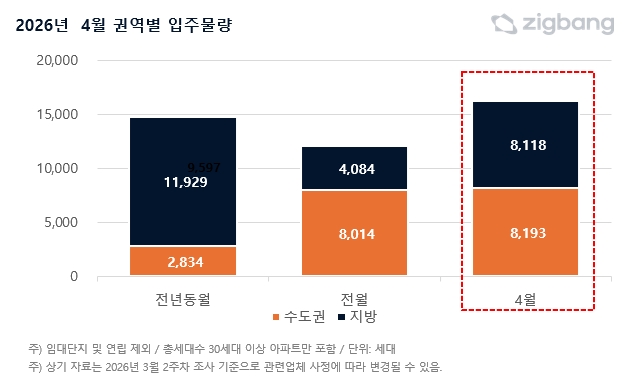 권역별로는 수도권이 8193세대, 지방이 8118세대가 입주한다. 수도권은 전월(8014세대) 대비 소폭 늘어난 반면, 지방은 전월(4084세대)보다 두 배 가까이 늘었다.