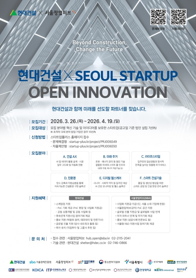 이미지 확대보기현대건설은 서울경제진흥원과 함께 ‘2026 현대건설×서울 스타트업 오픈 이노베이션’ 공모전을 개최한다고 30일 밝혔다.