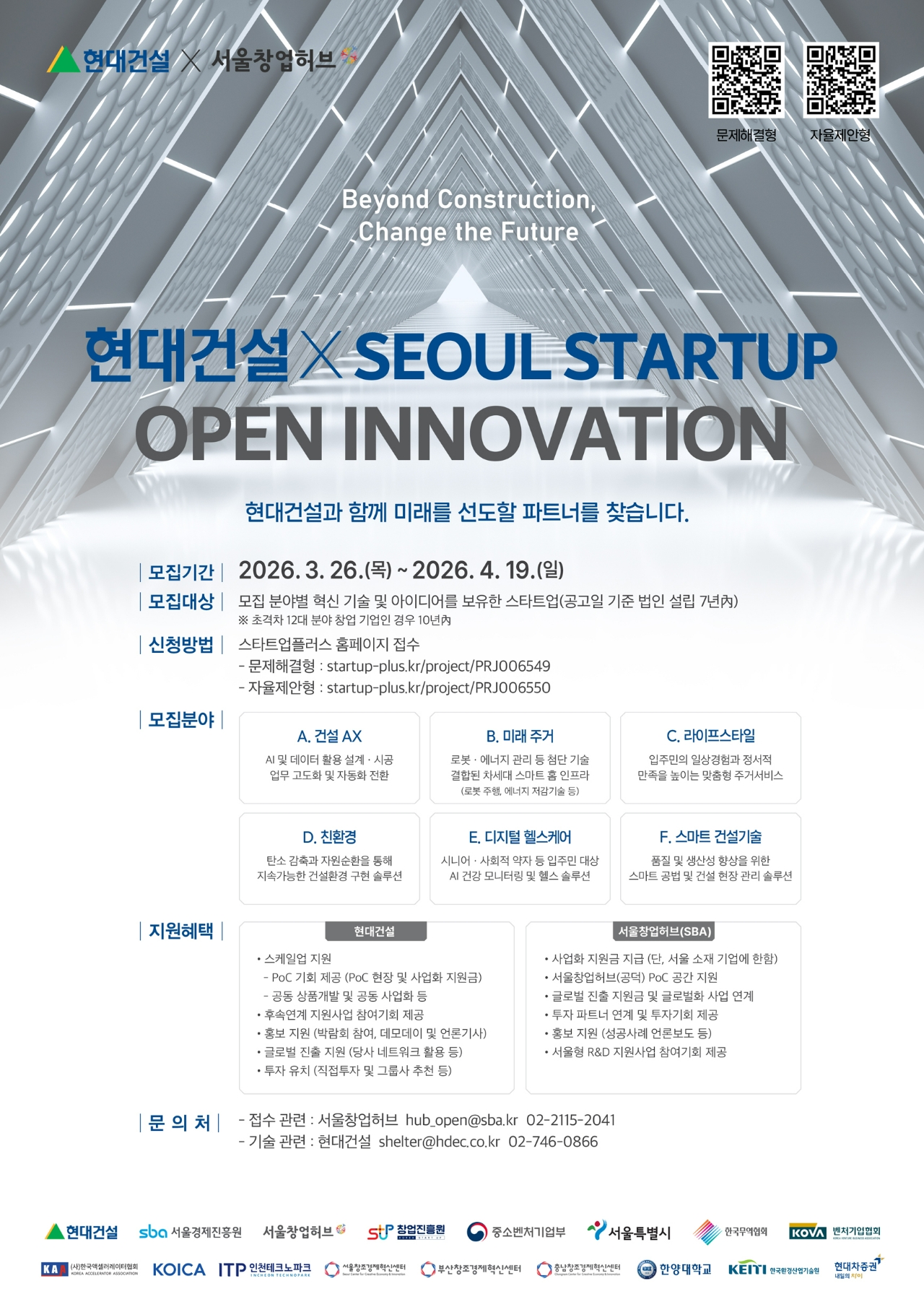 이번 공모는 건설AX, 미래 주거, 라이프스타일, 친환경, 디지털 헬스케어, 스마트 건설기술 등 6개 분야에서 진행된다. 지원 방식은 문제 해결형과 자율 제안형 중 선택할 수 있다.