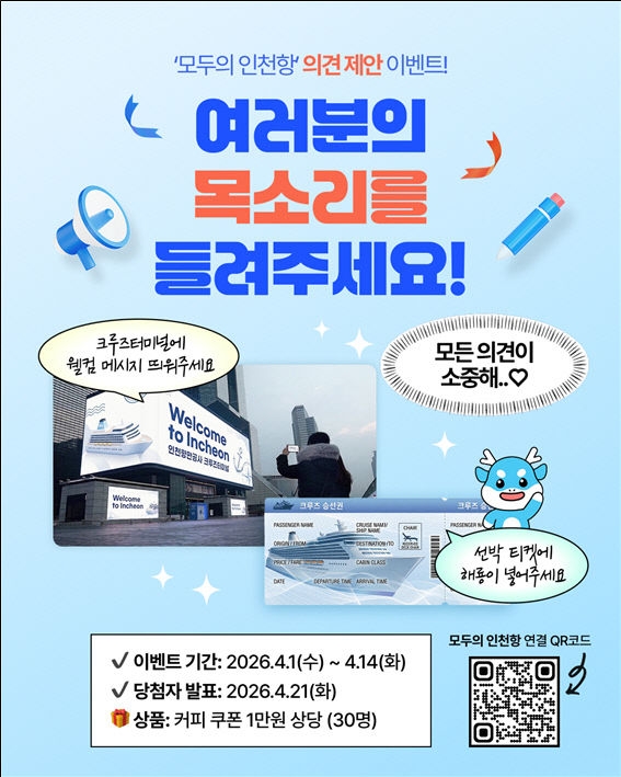 참여 방법은 인천항만공사 홈페이지 접속 후 회원가입을 하고, '모두의 인천항' 내 '제안해(海)·토론해(海)' 코너에 의견을 남긴 뒤 SNS 채널에 참여 완료 댓글을 작성하면 된다.