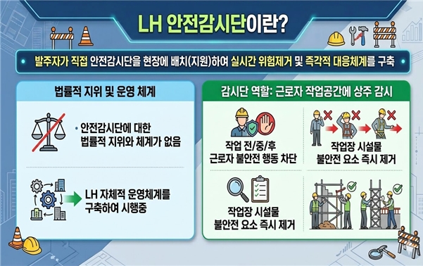 이에 LH는 발주자(LH)의 주도하에 근로자의 안전을 최우선으로 확보하고, 위험요인을 실시간으로 발굴․제거할 수 있는 근로환경 조성을 조성하고자 ‘안전감시단’ 제도를 도입한다.