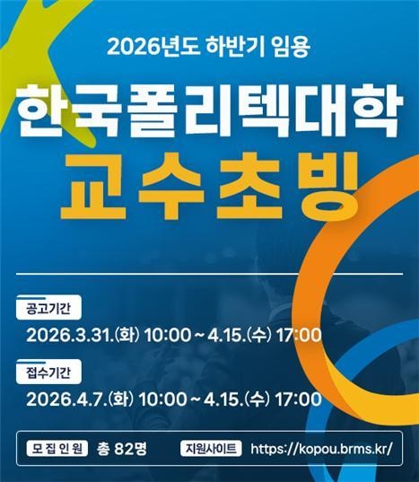 이미지 확대보기폴리텍대학이 전국 캠퍼스에서 올해 하반기 임용 교수 초빙 공고를 통해 총 82명의 교원을 공개 채용한다. 원서 접수 기간은 이달 15일까지다.