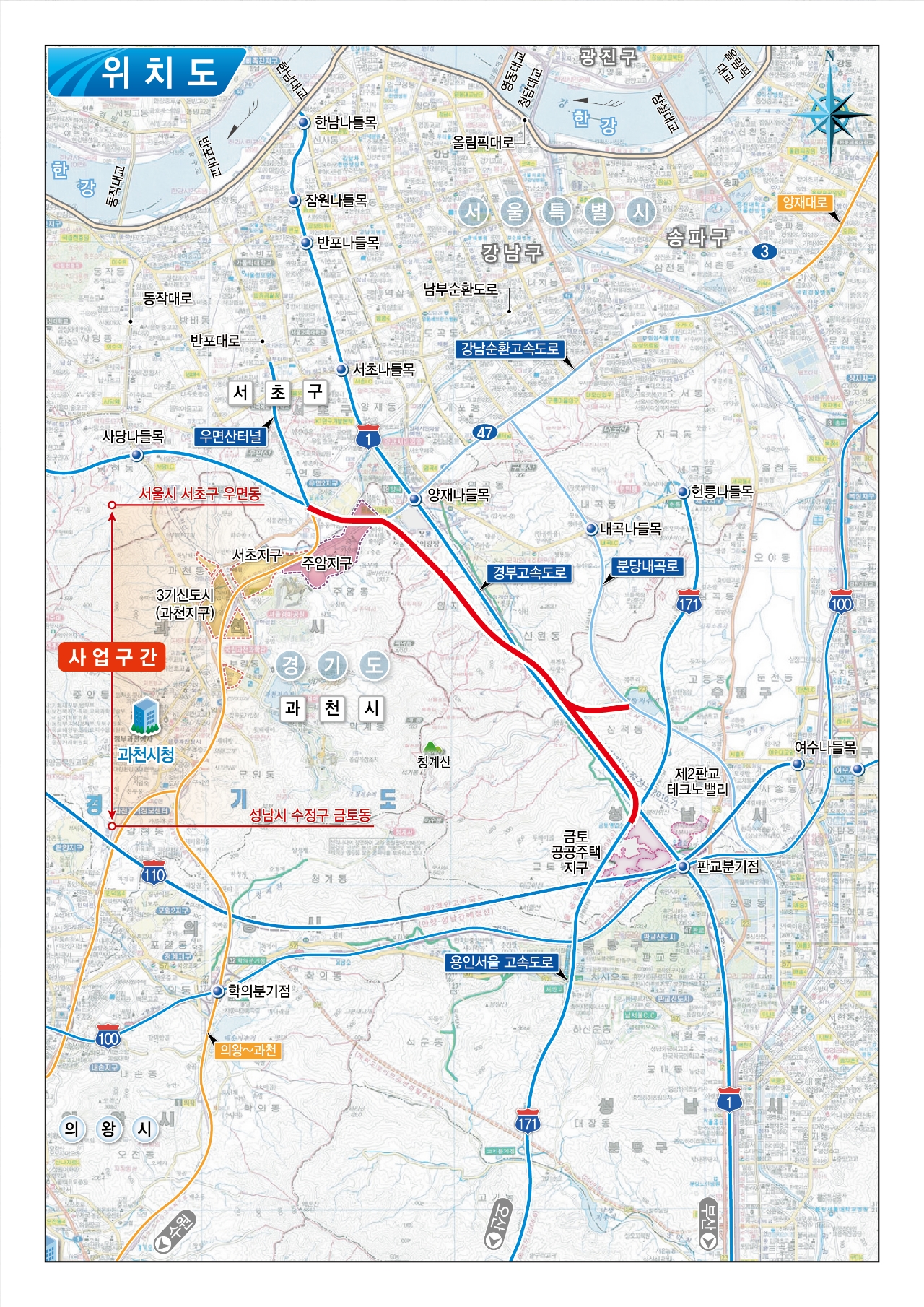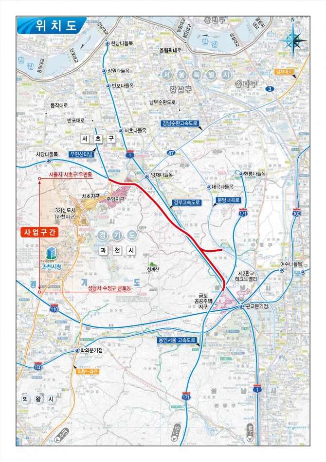 성남∼서초 고속도로 사업은 성남시 수정구 금토동과 서울 서초구 우면산터널을 잇는 10.7㎞ 구간에 왕복 4차로 고속도로를 건설하는 사업이다. 사업비는 5612억 원 규모다.