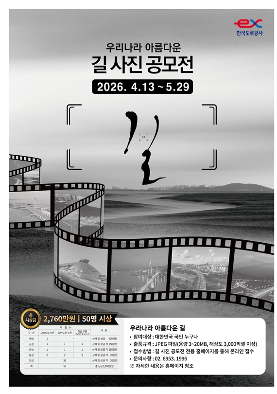 이미지 확대보기한국도로공사가 내달 29일까지 ‘우리나라의 길’을 주제로 국민 누구나 참여할 수 있는 ‘2026년 길 사진 공모전’을 개최한다.