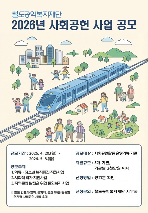 이번 공모는 △아동·청소년 복지 △사회적 약자 지원 △지역 문화 발전을 위한 문화복지를 주제로 하며, 특히 역·열차 등 철도 인프라를 활용한 사업을 우대한다.