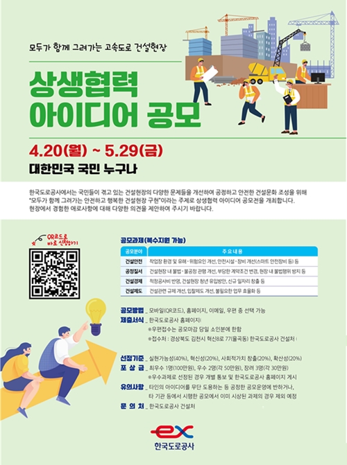 이미지 확대보기한국도로공사가 내달 29일까지 건설 현장에서 발생하는 다양한 문제를 개선하기 위해 ‘고속도로 건설 현장 상생협력 아이디어’ 공모를 실시한다.
