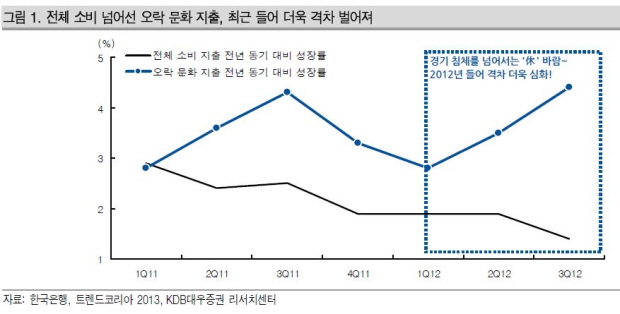 문 연구원은 한국인들의 소비 패턴 변화가 이뤄지고 있는 상황에서 오락 문화 소비주에 대한 관심이 지속적으로 필요할 것으로 판단했다.