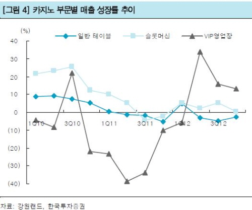 강원랜드의 4분기 매출액과 영업이익은 컨센서스를 각각 4%, 13% 하회했다. 일반영업장 매출은 전년동기대비 2.7% 감소했고, 슬롯머신 매출도 전년동기대비 0.3% 증가하는데 그쳤다.