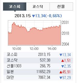 시가총액 상위종목별로는 현대차(0.69%), 현대모비스(0.80%), 기아차(0.36%), NHN(3.8%), 삼성생명(0.96%)등이 올랐다. 반면 포스코(2.97%), 한국전력(0.92%), LG화학(3.04%), 현대중공업(1.86%)등이 하락했다.