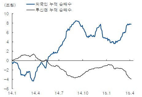 이날 증시에서는 외국인과 기관이 각각 946억원과 606억원을 순매수한 반면 개인은 1379억원의 매도 우위였다. 외국인의 매수세는 유럽중앙은행(ECB) 양적 완화로 인해 자금유입이 확대된 것으로 외국인은 최근 3개월 동안 약 3조원에 달하는 매수세를 보이고 있다.